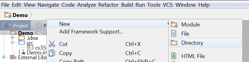 directory itself.To create a test directory, right-click on the project itself, and select New -> Directory: