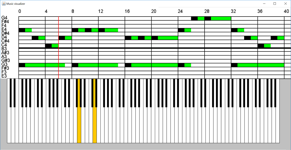 You should control the red line in this view using the left and right arrow keys on your keyboard. When the red line is at a particular beat, the keyboard should show which keys are pressed to play the notes being played at that beat (shown above in orange). You are free to choose any colors you want. The left and right arrow keys advance and go back by a beat respectively.