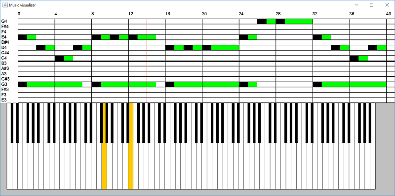Use the mouse listeners to enable adding a note by clicking on the appropriate key in the keyboard portion of the visual view. You may assume that this can be done only when the music is not playing (so that the user is not racing with the music player). You may also assume that the user can first scroll the red line to the appropriate beat and then add a note that starts at that beat. Finally you may assume that a single click adds a note of single beat duration of the appropriate pitch.