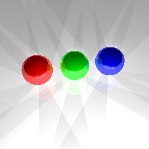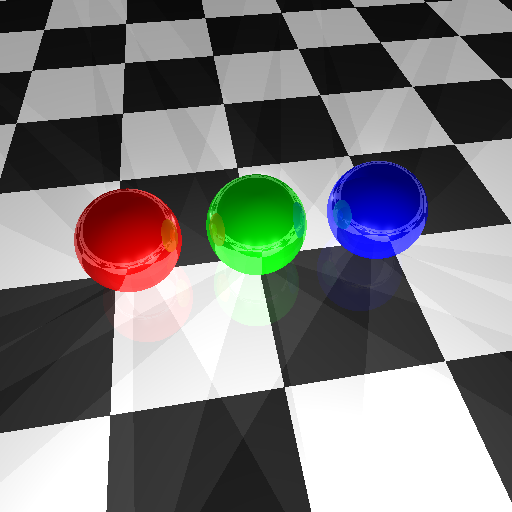 In this rendering, diffuse and specular shading are turned on, shadows are turned off, and the maximum recursion for mirror reflection computations is 2.