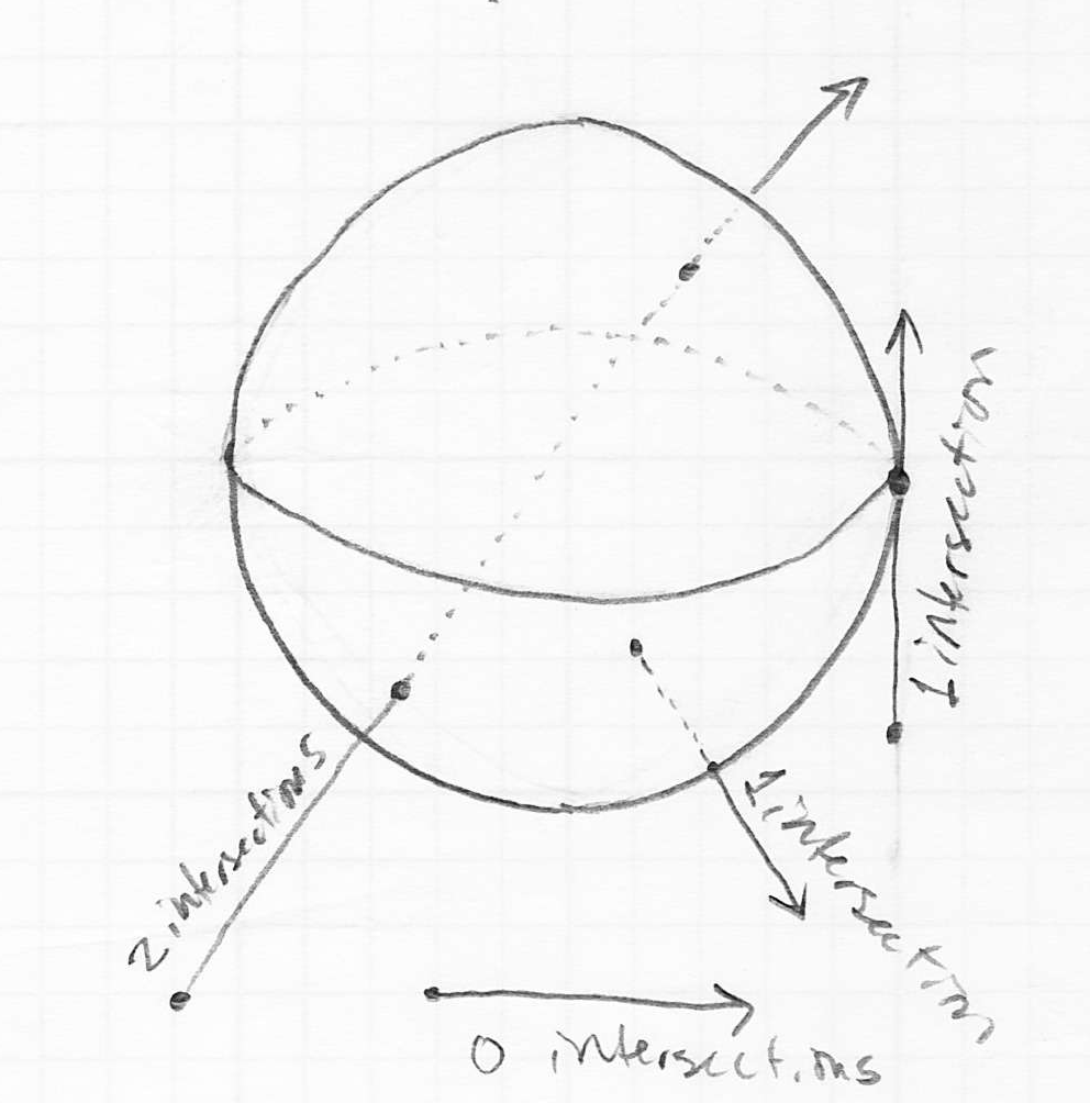 is negative (this corresponds to no intersection) - there is one solution when the discriminant is zero (this corresponds to the ray being exactly tangent to the sphere)