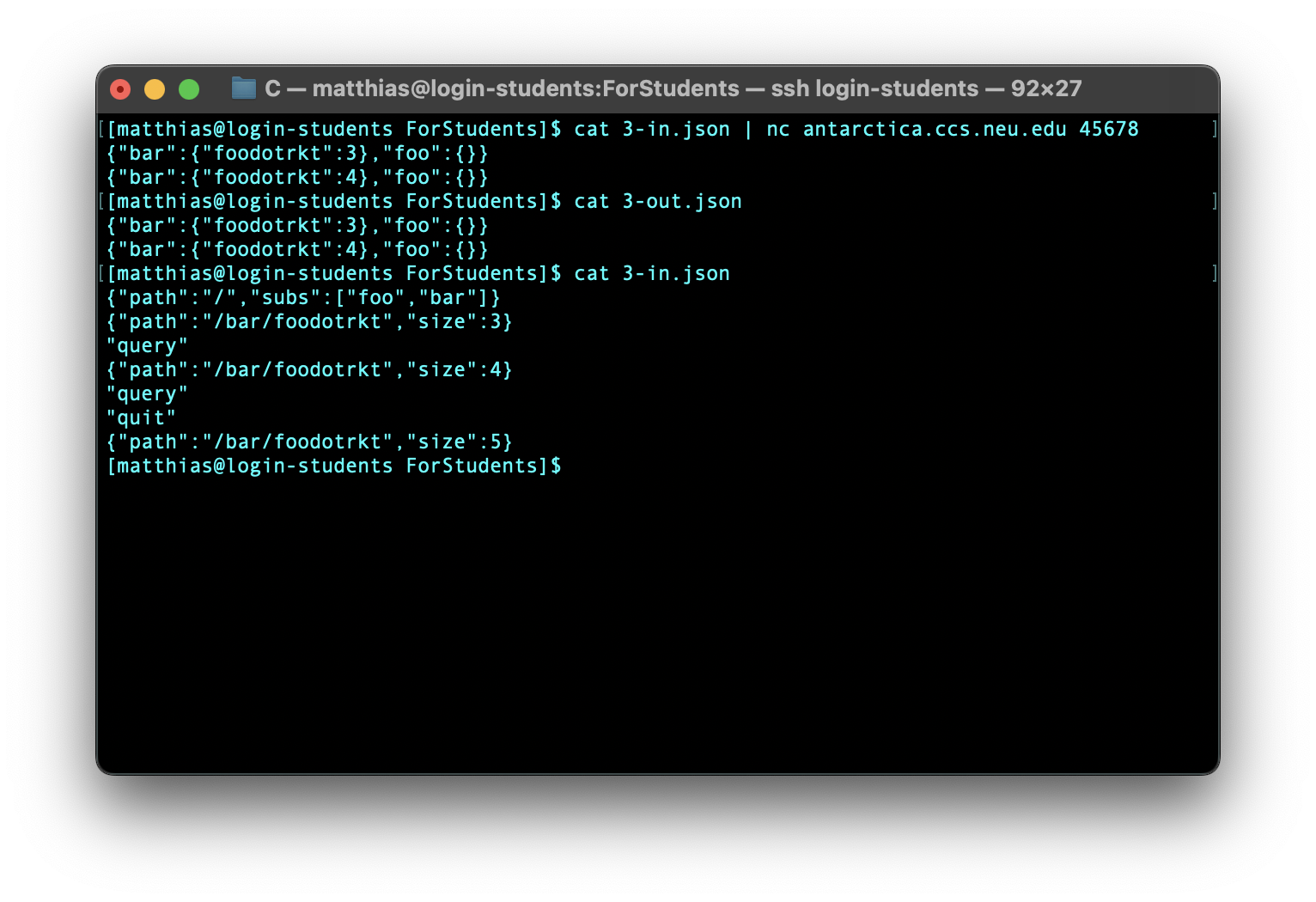 The nc command sends JSON values from login-students to antarctica.ccs.neu.edu, one at a time. The server responds with the expected results as the remaining file-display lines (cat) show.