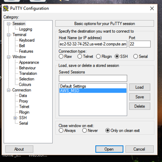 To connect to your instance, enter your instance' public DNS or its public IP in the Host Name (or IP address) slot. You want to connect via ssh on port 22. If you want to save this connection information, which is a good idea if you plan to visit the instance again (and again), save the session information with a useful name.