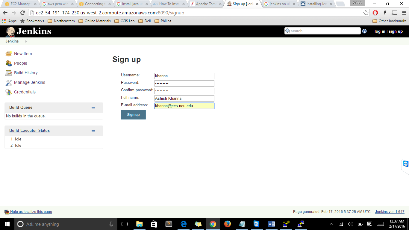 You should now see a sign up and login link on top right of the Jenkins banner. Go ahead and sign up.