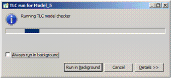 Clicking on run will cause the Toolbox to validate the model and, if it finds no errors, to run TLC on the model. The Toolbox shows the following dialog while TLC is running: